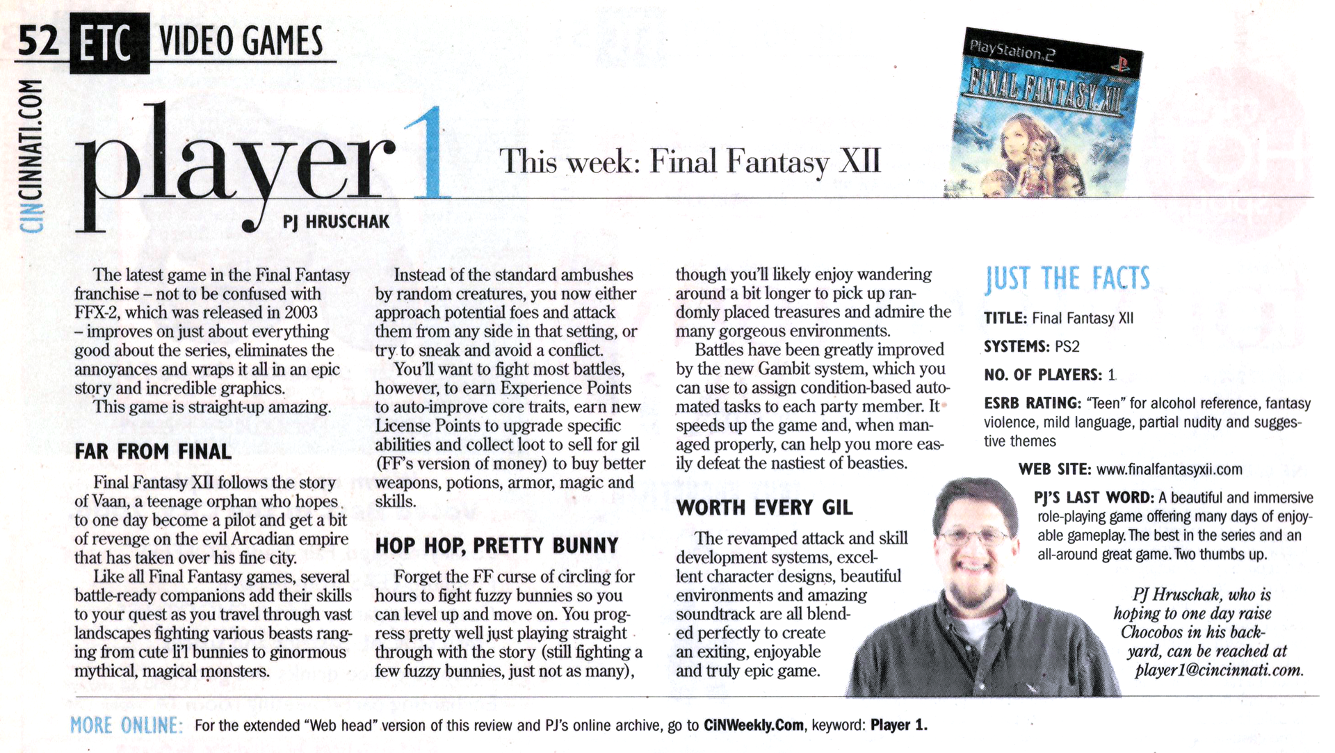 A story about a young man wanting to be a pilot to overthrow an evil empire ... if you think FFXII sounds a bit Star Wars-y, I'll agree. Heck, even Hitoshi Sakimoto's soundtrack occasionally sounds a bit similar to John William's scores. Several of the ships and battle scenes are reminiscent of the newer films in the double trilogy. Of course, George Lucas has admitted that many of his films' stories were influenced by Japanese filmmaker, Akira Kurosawa, so I'll chalk it up to cross-inspiration with somewhat similar development facilities. With the game industry borrowing more heavily from film talent, the two media will continue to converge until we're given game controllers at the ticket counter. But I digress.