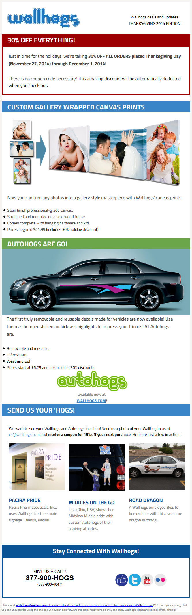 This was one of several email newsletters I wrote, designed and distributed for Wallhogs (via MailChimp). I redesigned their bland customer email newsletter so it looked a bit more interesting, had trackable links (including links to their social media accounts) and included customer-/user-generated content. I used A-B testing to determine the subject line that resulted in the most reads before sending to the full distribution list. (The customer examples did change each email, but I didn't have a screenshot of the final version.)