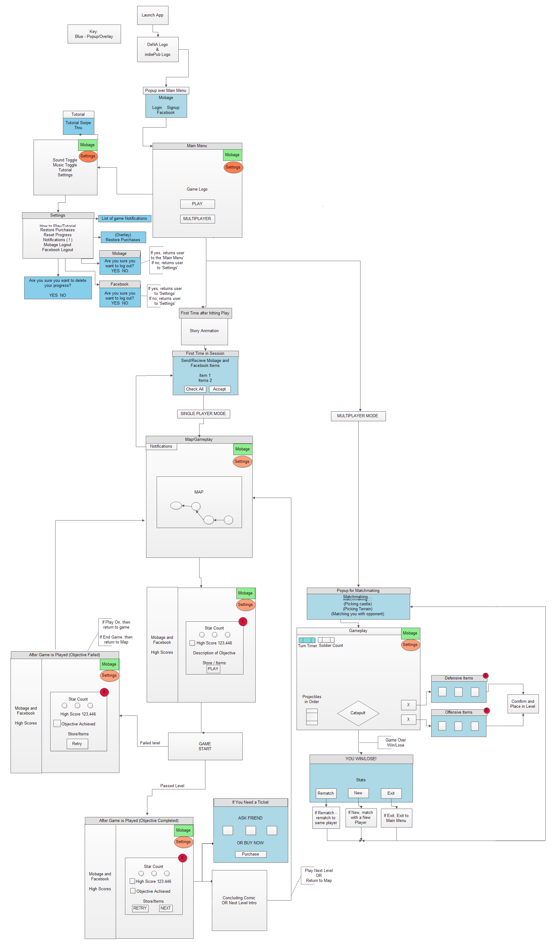 Smash the Castle was a game we were under contract to develop for DeNA and were producing internally. I was essentially the game's designer and producer: I wrote the original concept, user flow (shown below), pitch docs, story, GDDs, documentation and communications with DeNA. As you can see, we planned on having an online component with competitive matches and friendly boosts.