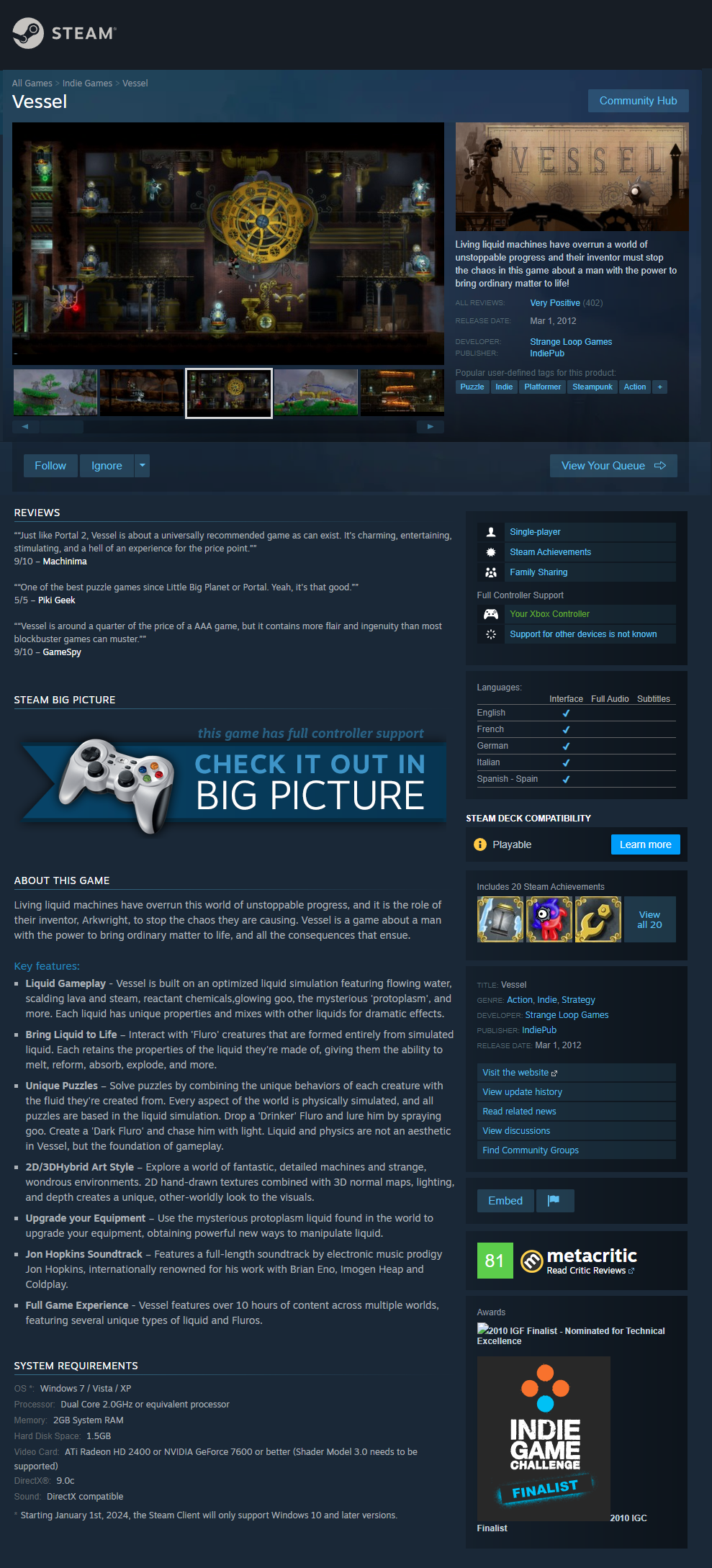 Vessel is a quirky puzzle game with a great underground steampunk look and feel. I ended up writing a lot of marketing copy for Vessel for Zoo and indiePub, including marketplace descriptions and press releases, with a lot of feedback from the developers (who