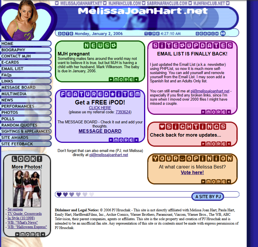 The site underwent many revisions over the years, so you're seeing only the final version below. The top bar is Flash with multiple rollover effects (which, sadly you cannot see here - thanks Adobe), a live local clock, the date and a Google site search feature. The side nav and homepage content area show the many features the site incorporated including e-Cards you could send to friends, random MJH quotes, a message board/forum, news updates and polls. At its peak, I had about nine domains pointing to the site, including MJHFanClub.com and SabrinaFanClub.com.